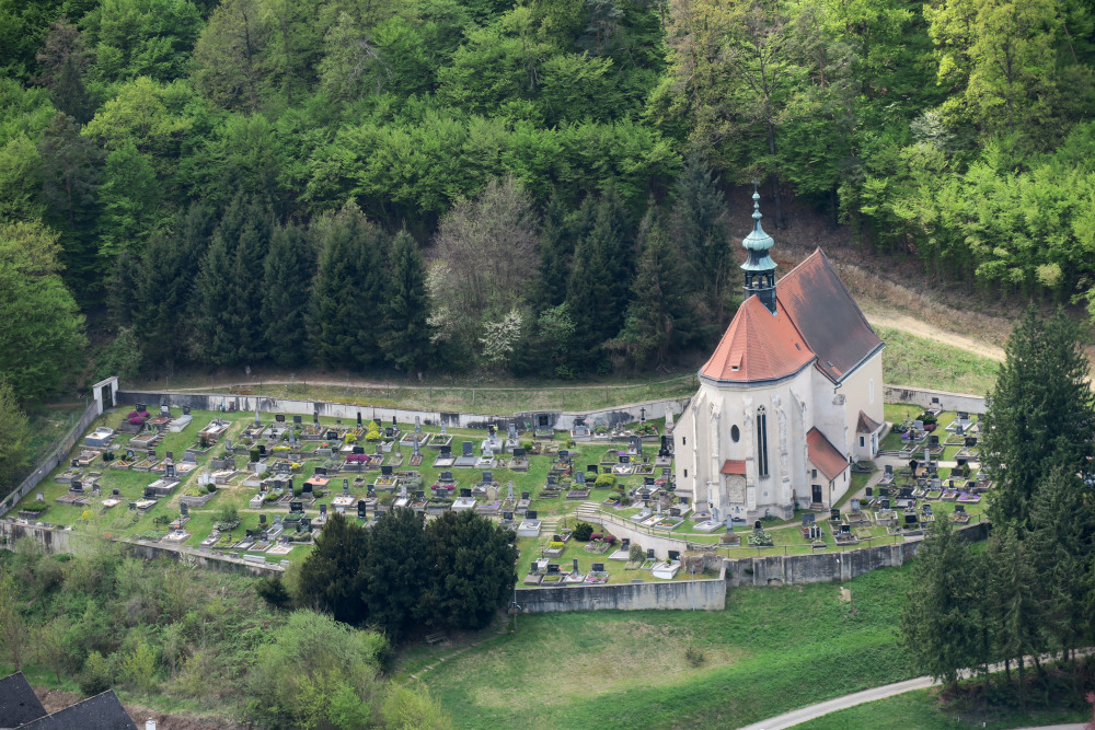 Der in den meisten Karten nicht eingezeichnete Steig alias Trail führte ohne Kompromisse direkt nach Klein-Wien und ich kam genau gegenüber der Kirche St. Blasius im Tal heraus. Klein-Wien hat nichts mit der Stadt Wien zu tun, sondern kommt von althochdeutsch Wihen (Weihen) und deutet auf Kirchenbesitz hin.