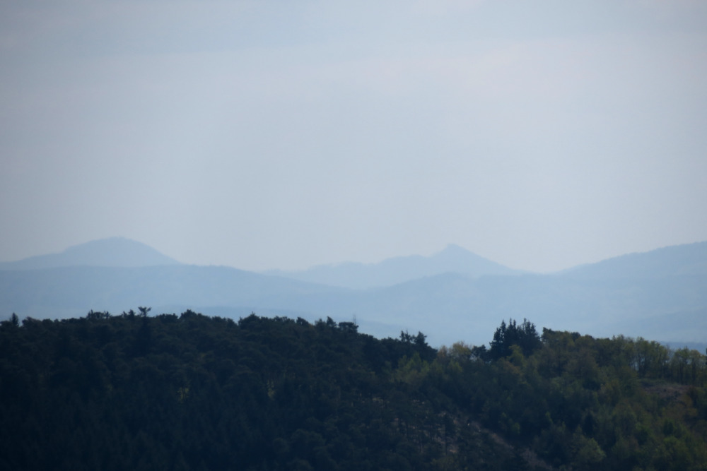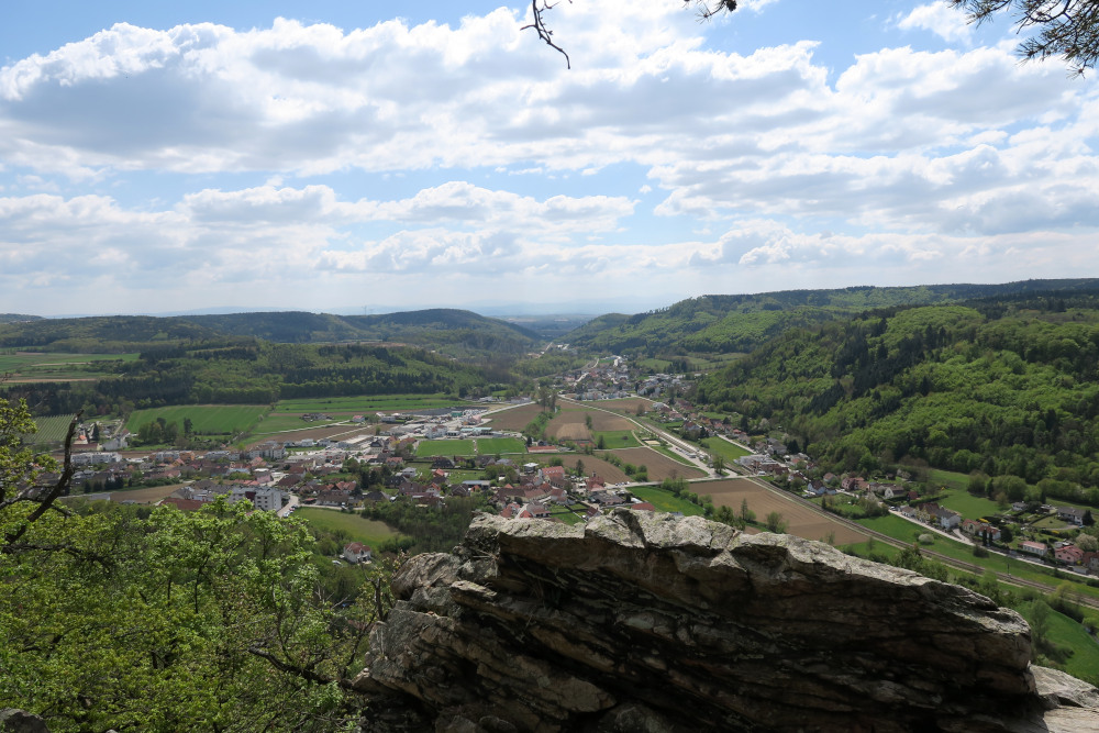Ich folgte dem Wegweiser „Predigtstuhl“ und gelangte zu diesem Aussichtsfelsen: Links Mühlberg, rechts Großer Anzingerberg, im Hintergrund blass die Alpen.