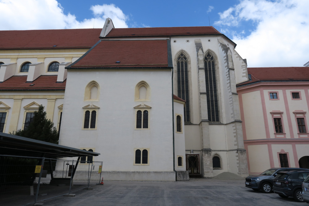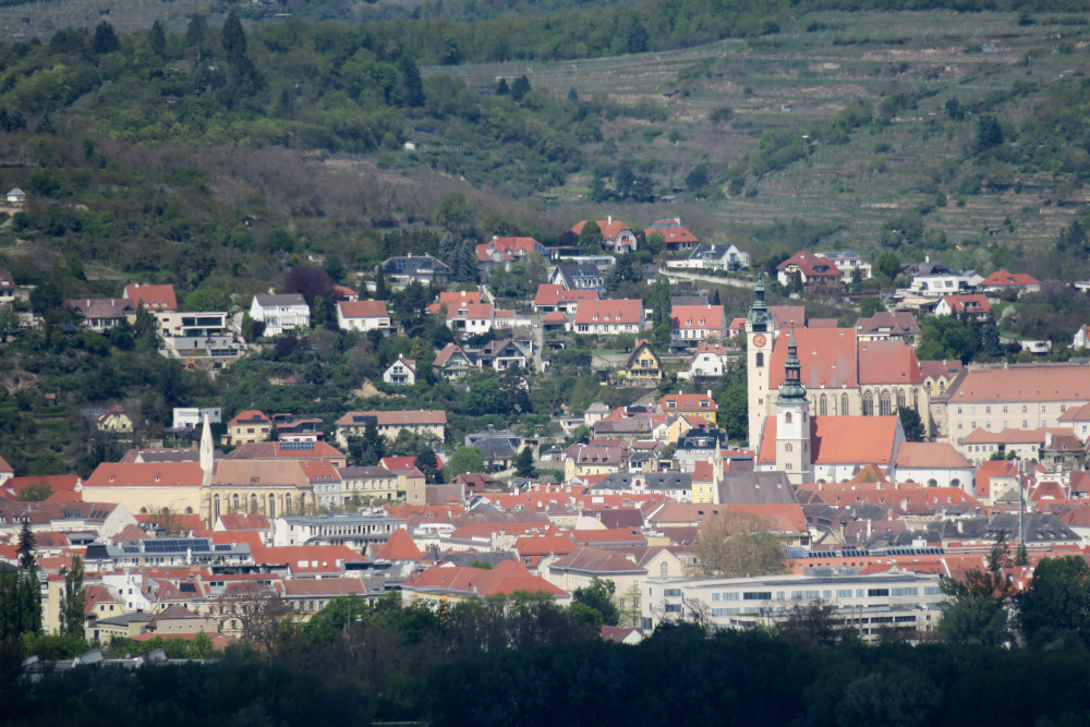Krems an der Donau – mit vier Kirchen auf einen Blick: Ganz links die ehemalige Klosterkirche der Dominikaner, um 1240 erbaut, Chor aus dem Jahr 1320/1330. Rechts unauffällig die spätgotische Bürgerspitalkirche aus dem Jahr 1470. Ganz hinten die Piaristenkirche (auch: Frauenkirche), 1014 erstmals urkundlich erwähnt und damit die älteste Kirche der Stadt – in der heutigen Form spätgotisch ab dem mittleren 15. Jahrhundert errichtet. Der Kirchturm stammt in den unteren Teilen noch aus der Gründungszeit. Davor die ehemalige „Mutterpfarre“, die Stadtpfarrkirche. Der untere Teil des Turms stammt aus dem frühen 13. Jahrhundert, das Langhaus wurde im frühen 17. Jahrhundert neu errichtet.