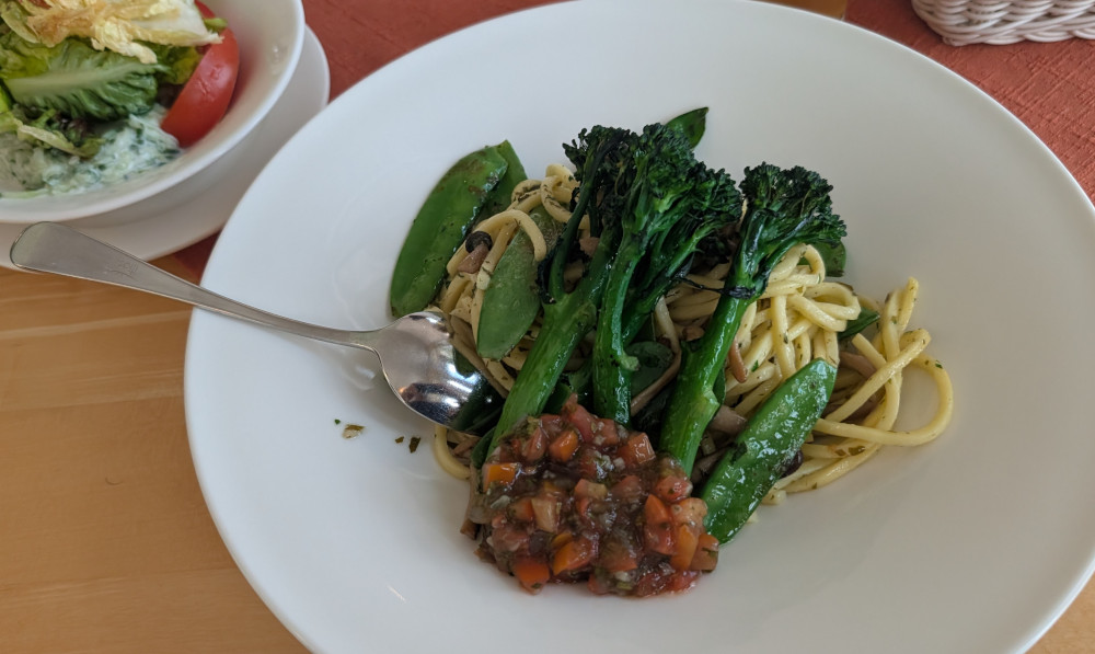 Im Stiftsrestaurant konnte man hervorragend essen. Ich wollte nichts Fleischliches und entschied mich für „Pasta mit Wildem Brokkoli, Tomaten, Zuckerschoten und Buchenpilzen“ – dazu noch ein Gemischter Salat.