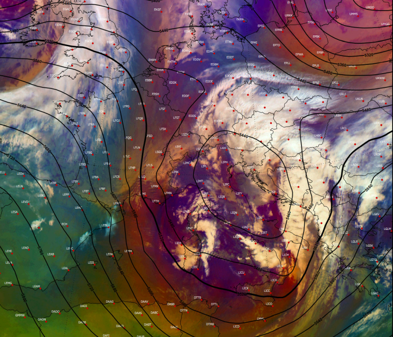 Der Grund für den späten Schneereigen war dieses formschöne Adriatief mit ausgeprägter Dry Intrusion über Kroatien, Saharastaub-Cirrus über Thüringen, Sachsen, Südpolen und teilweise Ungarn. Der Okklusionspunkt lag über Ostösterreich. Insgesamt intensive Hebung durch Aufgleiten der milden Mittelmeerluft auf einströmende Kaltluft aus Norden, zugleich Staueffekte.