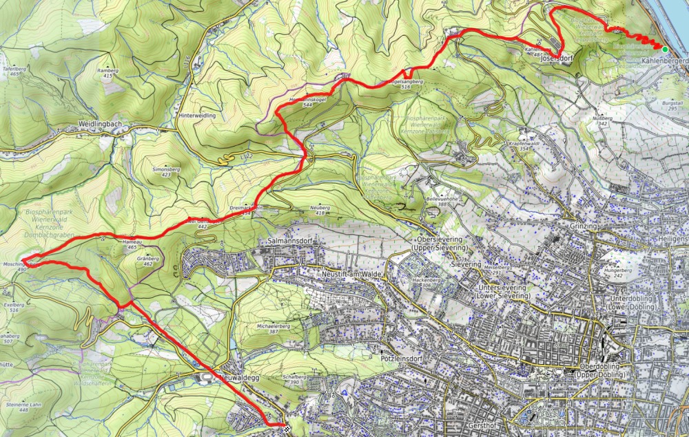 Langsam geht mir die monotone Witterung auch auf die Nerven. Zu wenig für Schneeschuhe, zu kalt zum länger Verweilen im Freien und die Hütten oft gesteckt voll an den Wochenenden. Für manche ambitioniertere Routenführungen liegt wieder zu viel Schnee und Eis. Kurz hatte ich überlegt, nach Salzburg zu fahren und auf den Gaisberg zu gehen, doch auch da sitze ich lieber im Freien und lasse mir die Sonne auf den Bauch scheinen. Bei der Kartendurchsicht fiel mir auf, dass ich den Irrweg ab Kaltenleutgeben noch nie gegangen bin. Zudem war ich auch am Kleinen Flösslberg erst einmal, zu Pandemiebeginn, und hatte entsprechend kaum nennenswerte Erinnerungen daran. Dieses Mal keine Probleme bei der Anfahrt, halleluja.
