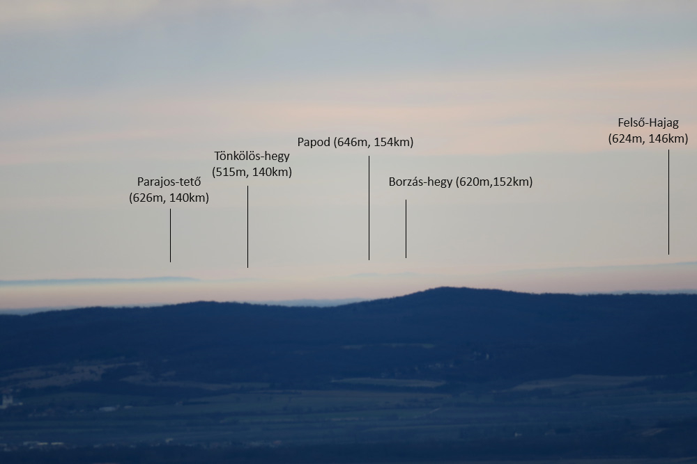 Kék-hegy (660m, 144km), Köris-hegy (704m,143km – höchster Gipfel) und Nagy-Som-hegy (649m, 147km).